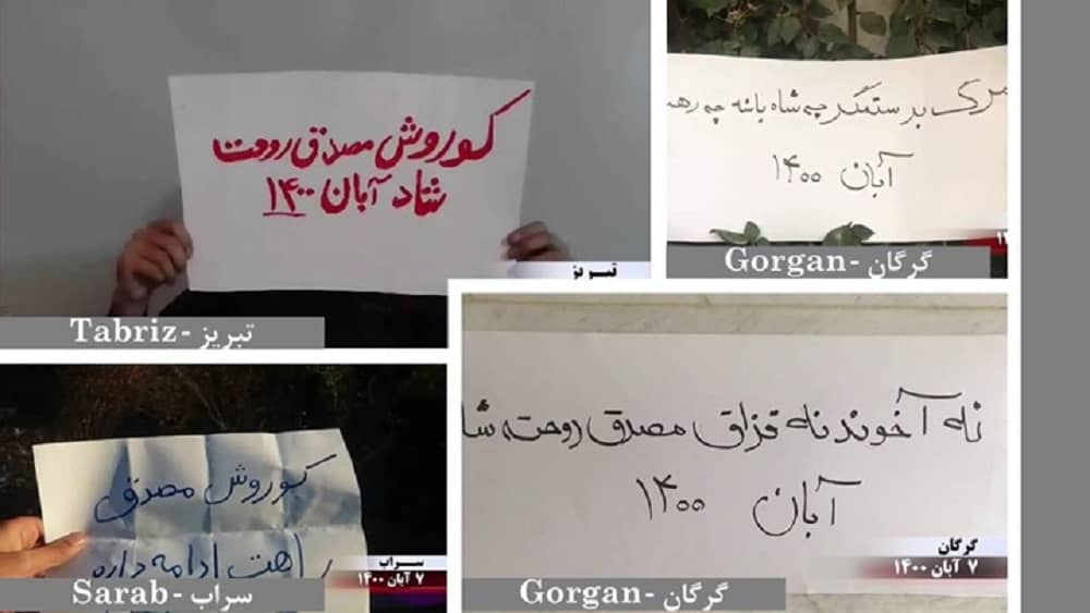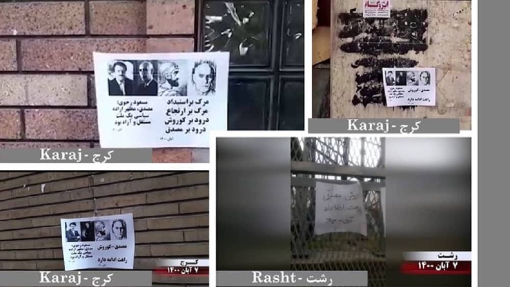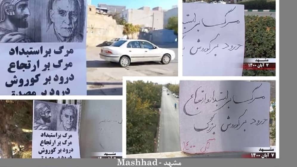 NCRI logoSupporters of the Mojahedin-e Khalq (MEK/PMOI) and the Resistance Units commemorated the “Day of Cyrus the Great” on October 29, 2021, by placing placards, banners, and writing graffiti. In addition to Tehran, these activities were carried out in other cities across Iran, including Shiraz, Mashhad, Qazvin, Neyshabur, Karaj, Kermanshah, Ardabil, Rasht, Tabriz, Qom, Gorgan, Behbahan, Izeh, Shahriar, and Sarab.